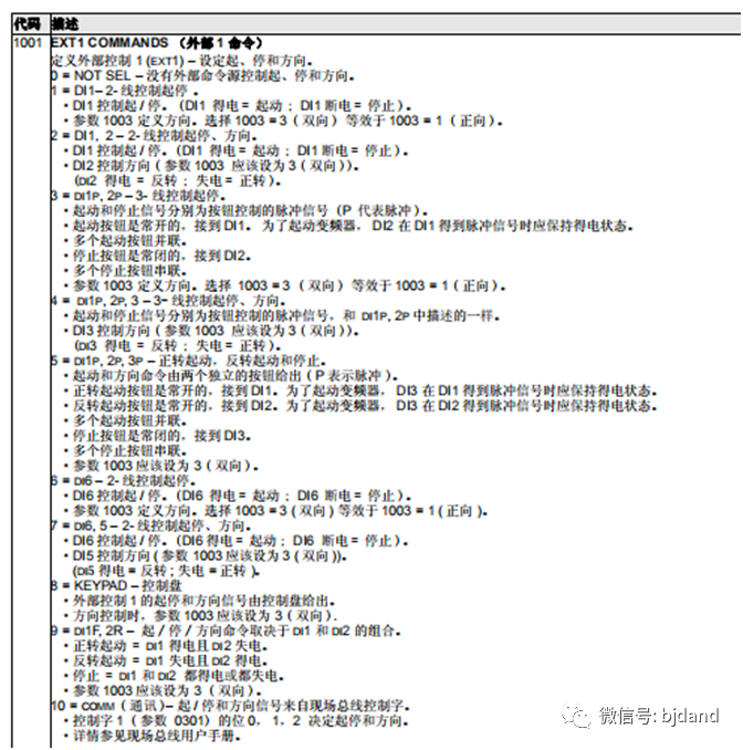 變頻器調試過程中,必須確保參數設置和端子接線的對應。下面是ACS510啟動/停止/方向參數的設置選項,任何一個選項都可以實現對變頻器外部控制1的運行/停止/方向控制。
