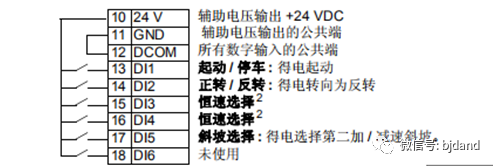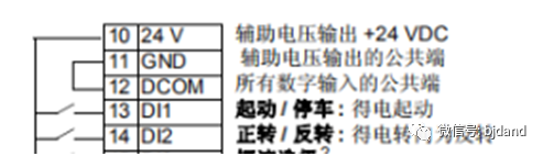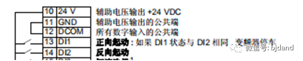 舉例1:如果變頻器的啟動/停止/方向控制信號接到13號(DI1)和14號(DI2),其中DI1控制運行,DI2控制方向,當DI1置高電平時,變頻器按照一個方向運行。DI1保持不變,DI2置高電平后,變頻器按照另一個方向運行。DI1置低電平停止。
