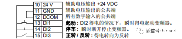 舉例2:如果變頻器的啟動/停止/方向控制信號接到13號(DI1)和14號(DI2)及15號(DI3),其中DI2接常閉按鈕作為停止,DI1接常開按鈕作為啟動,DI3接開關。當DI1收到脈沖后,變頻器啟動運行一個方向。DI3置高電平時,變頻器運行另外一個方向。當DI2(常閉)打開時,變頻器停止運行。