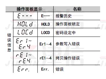 三菱變頻器錯誤信息包括E---,HOLD,LOCD,Er1~4,rE1~4,Err.