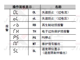 三菱變頻器報警信息包括OL失速防止 (過電流) , oL失速防止 (過電壓), RB再生制動預(yù)報警,TH電子過熱保護預(yù)報警 PSPU停止,MT維護信號輸出,SL速度限位顯示