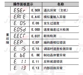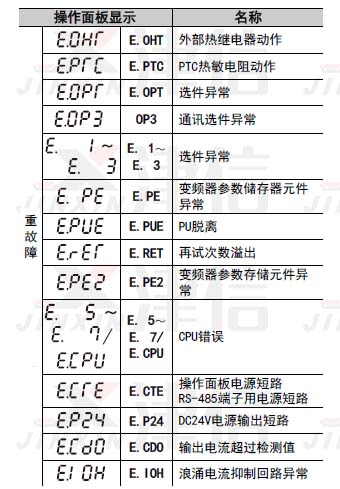 三菱變頻器重故障包括:E.OC1,E.OC2,E.OC3,E.OV1,E.OV2,E.OV3,E.THT,E.12,E.THM,E.FIN,E.IPF,E.UVT,E.ILF,E.OLT,E.GF,E.LF