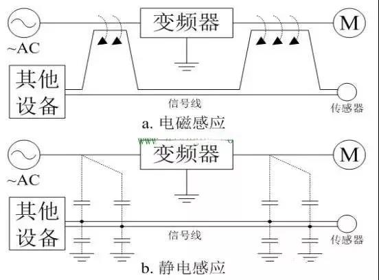 1、通用變頻器必須可靠接地,保證安全運行并有效抑制電磁于擾。干擾如下圖:
