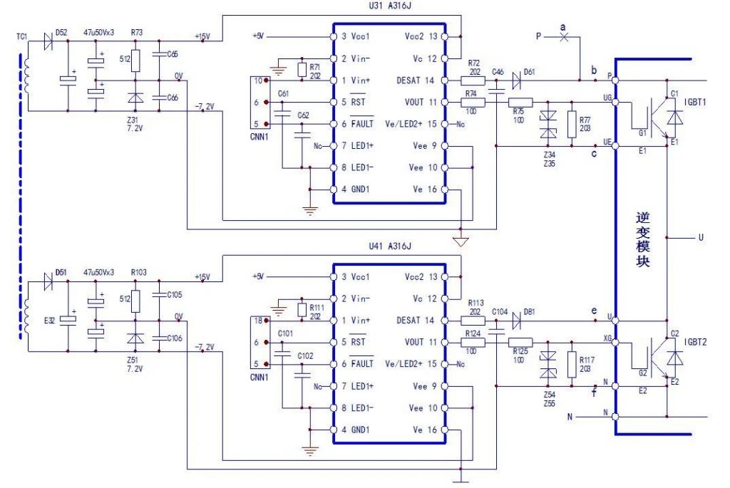 - 先檢查+15V、-7.2V的驅(qū)動(dòng)供電電源是否正常。若無(wú)負(fù)壓,檢查穩(wěn)壓電路并排除;測(cè)得輸出電壓偏低,A316有異常溫升,脫開(kāi)柵極電阻R74,供電電壓正常,為模塊內(nèi)部IGBT的G、E結(jié)漏電損壞,更換模塊;供電電壓仍低,挑開(kāi)A316的12/13腳,供電電壓恢復(fù)為正常值,更換A316J;